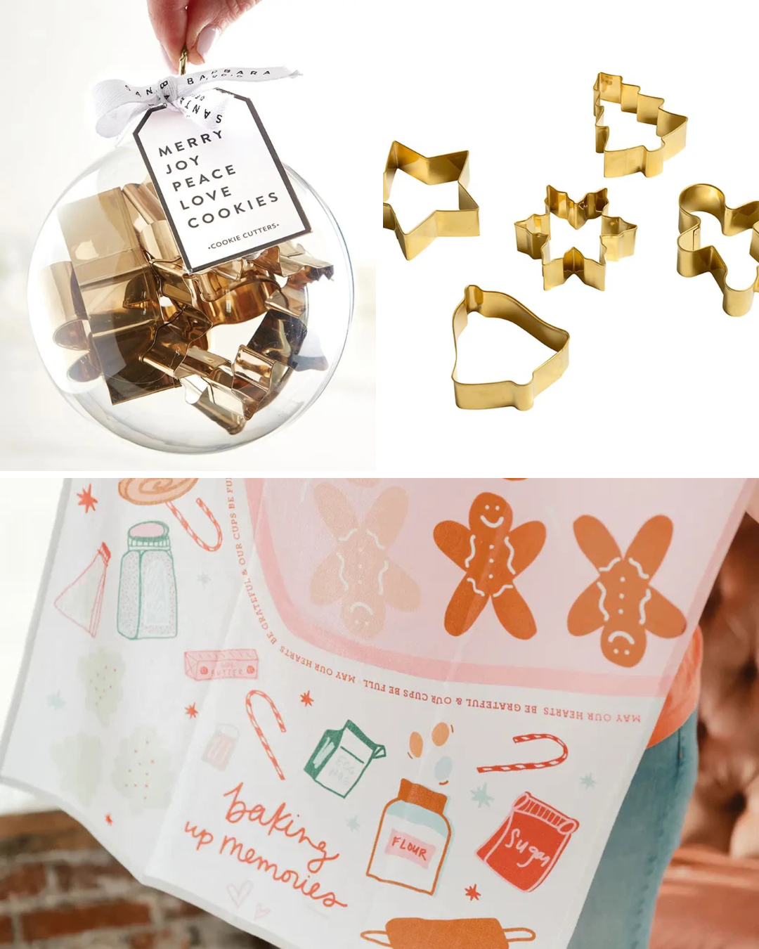 A $24 value - one cookie cutter ornament set with festive baking up memories kitchen towel.