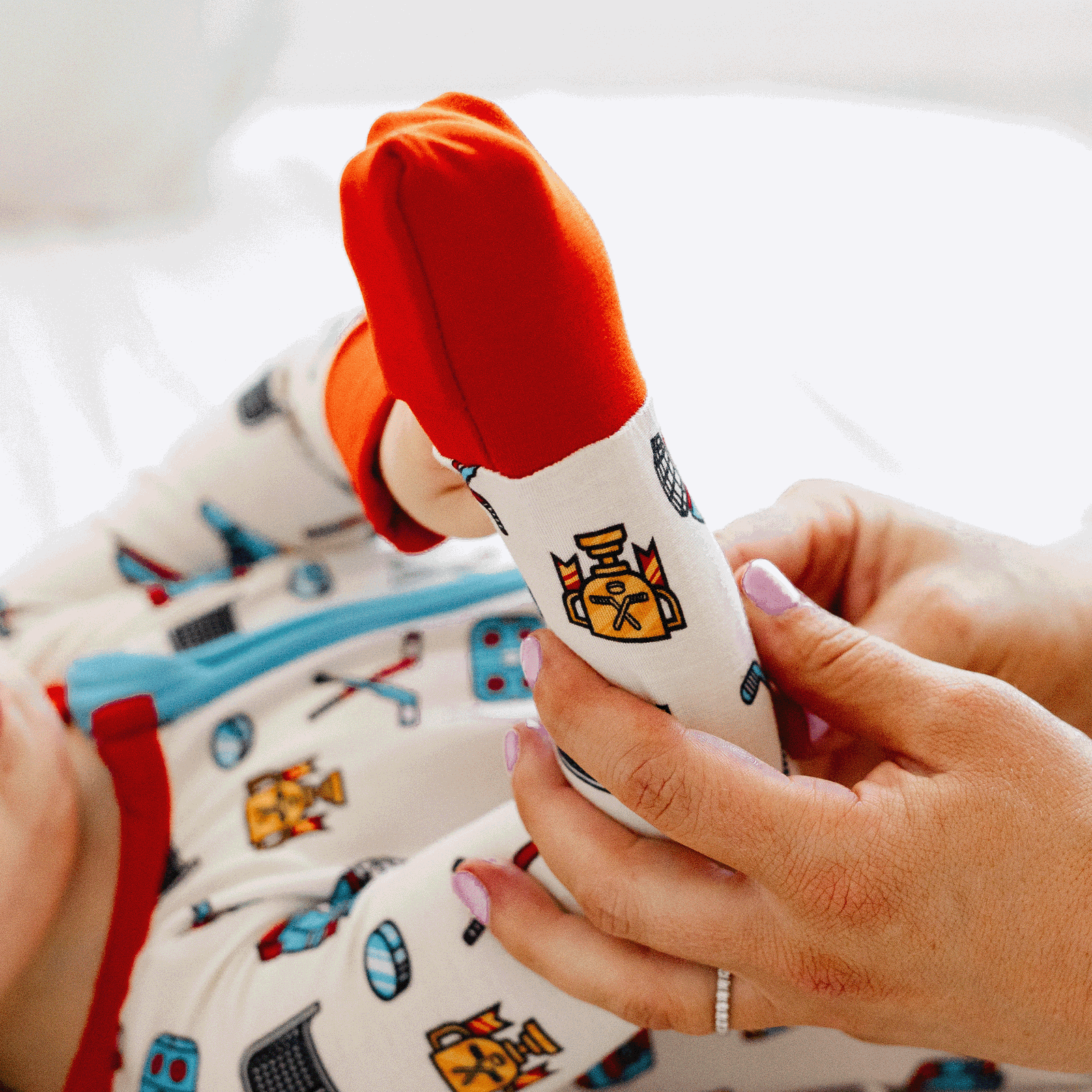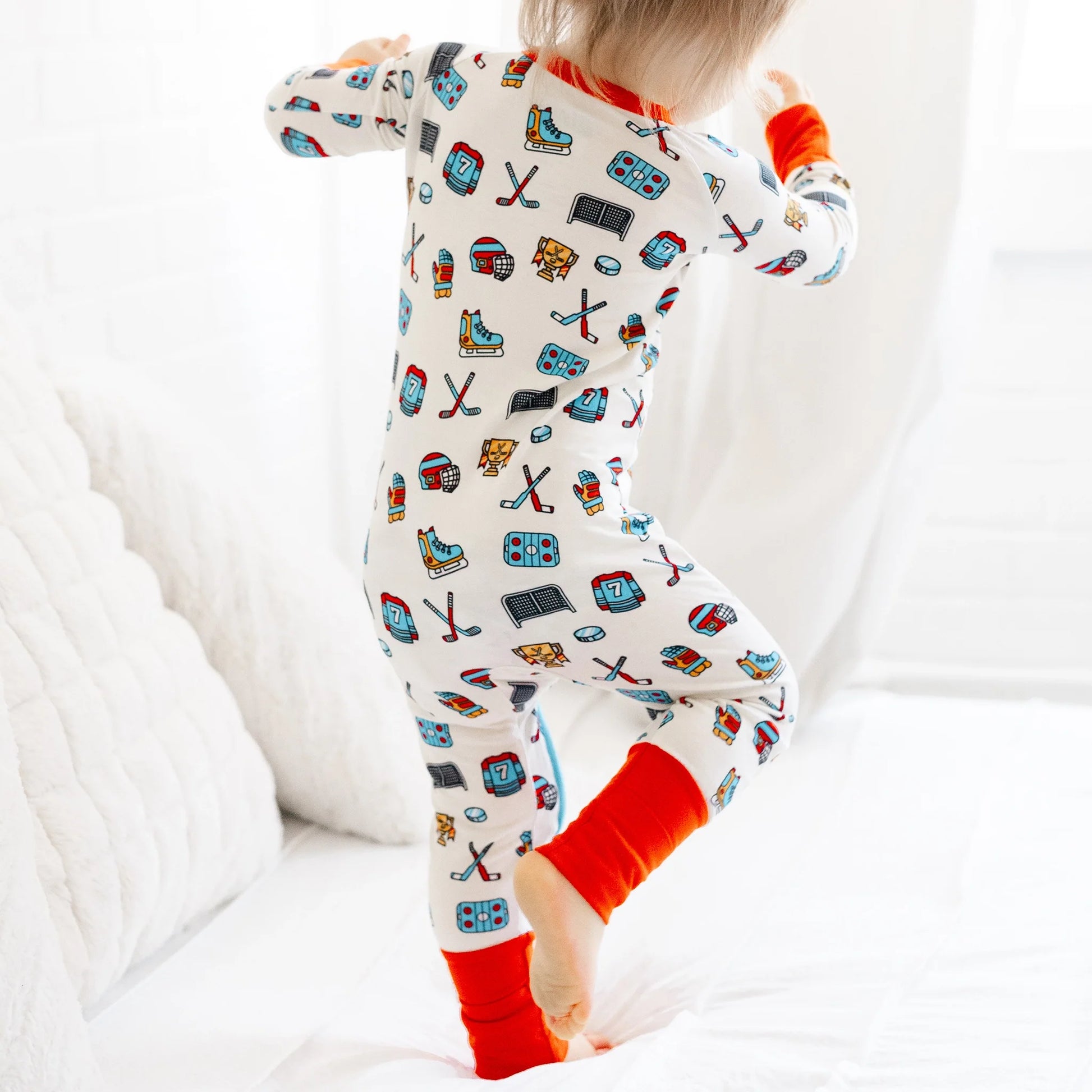 Suit up your future all-star in our ultra-soft Hockey One-Piece. Made from breathable bamboo fabric, this cozy sleeper is perfect for power naps, playtime breakaways, or cheering from the couch during hockey season. With an all-over print featuring pucks, sticks, and skates, it’s a fan-favorite for any mini MVP.