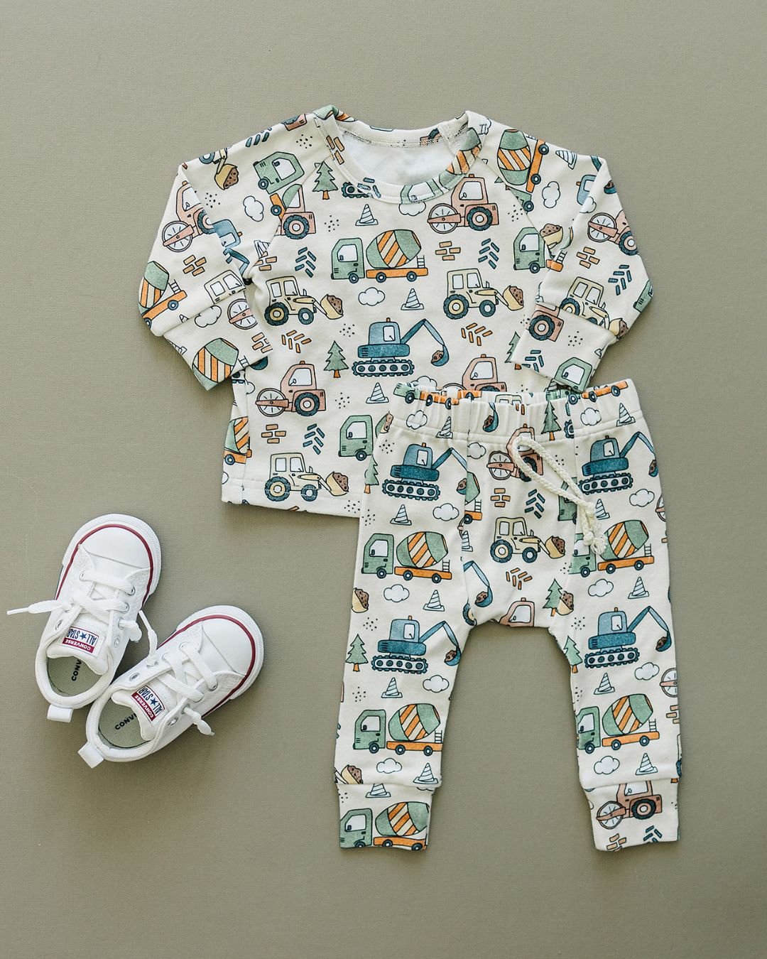 This adorable lounge set featuring construction trucks is a must-have! Made of ultra soft cotton and just the right amount of stretch, your little one will be comfy and cozy for any playtime activities! Bundle up in style with our popular lounge set!