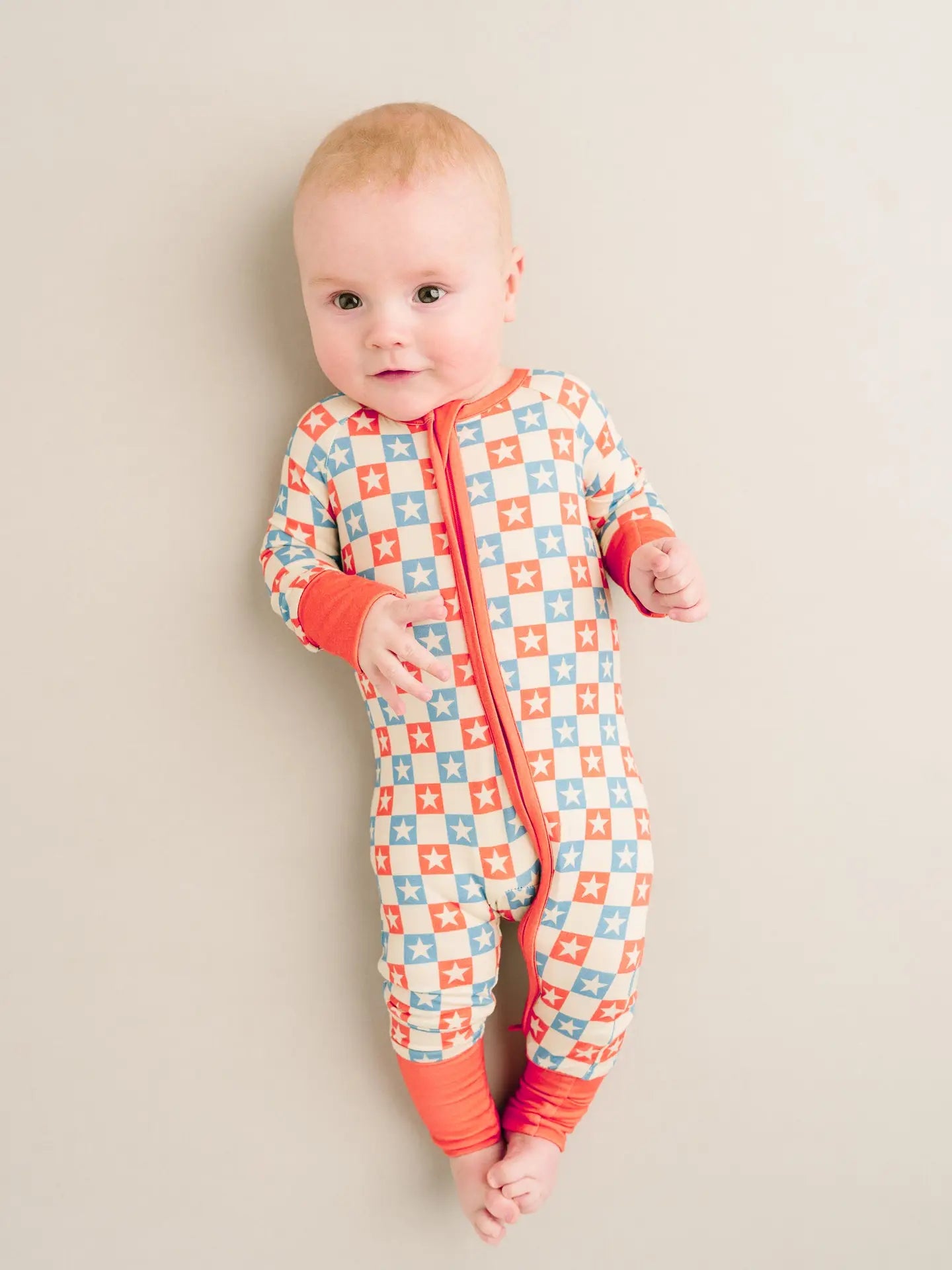 This patriotic checkered print bamboo sleeper is perfect for celebrating Fourth of July and Memorial Day. Crafted with bamboo fabric, it offers softness and comfort for your baby's sensitive skin. Embrace the holiday spirit while providing a comfortable and breathable onesie for your little one.