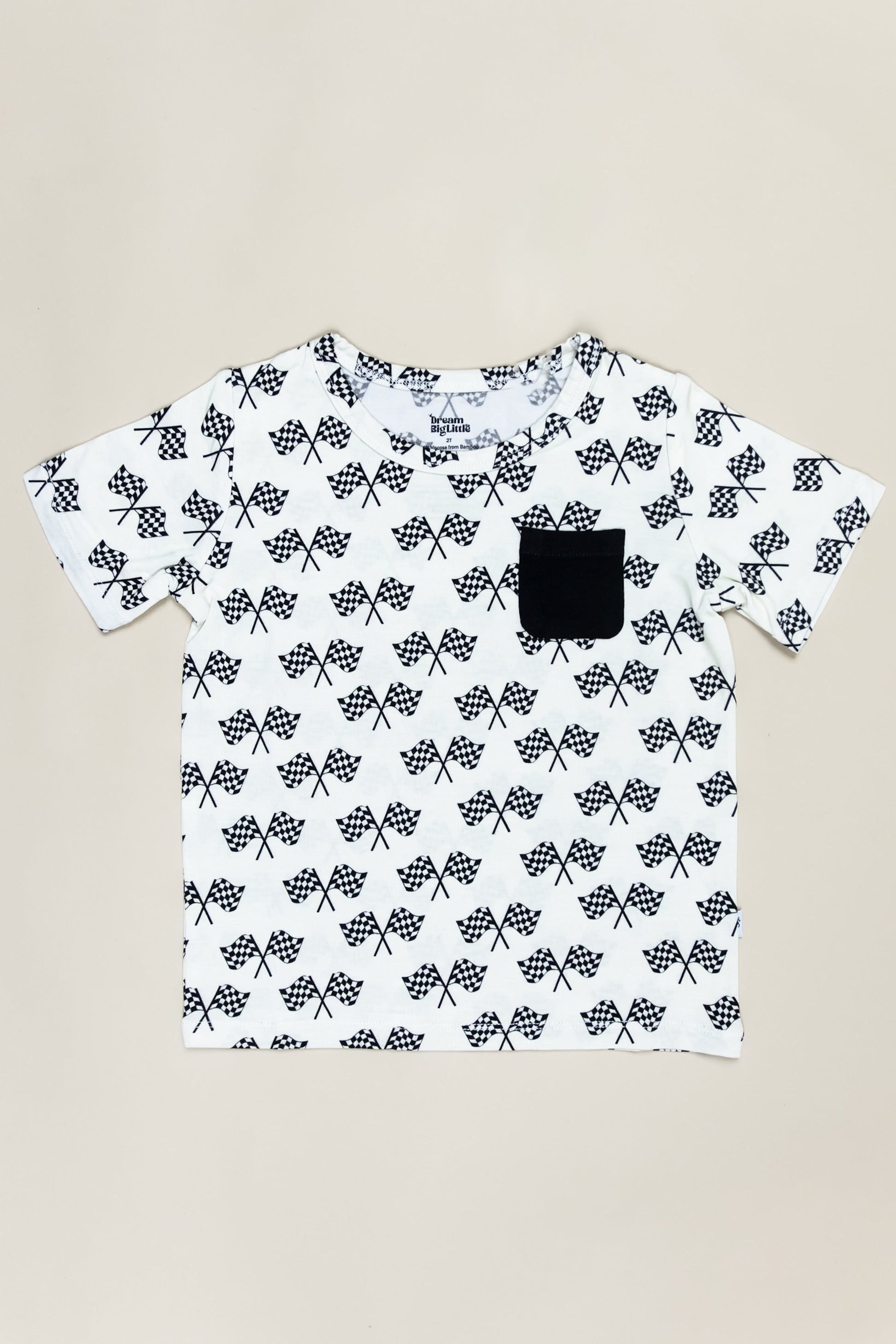 Take your style to the finish line with our Race Day Dream Pocket Tee. Made with comfortable bamboo material, this short sleeve top features a fun race print that will surely turn heads. Get ready to dream big and race in style.