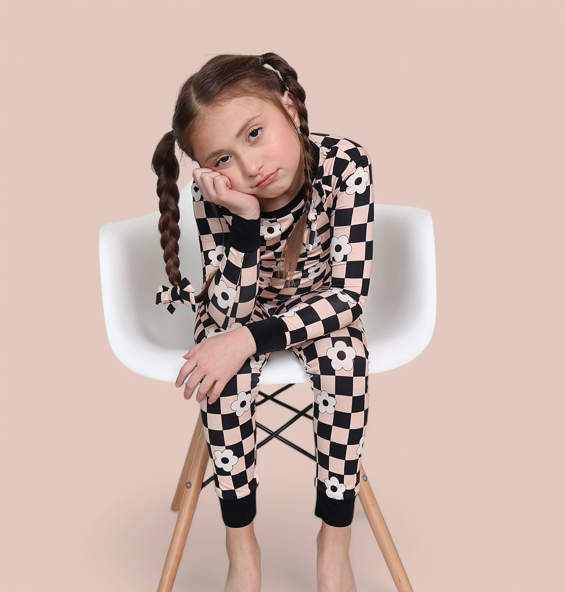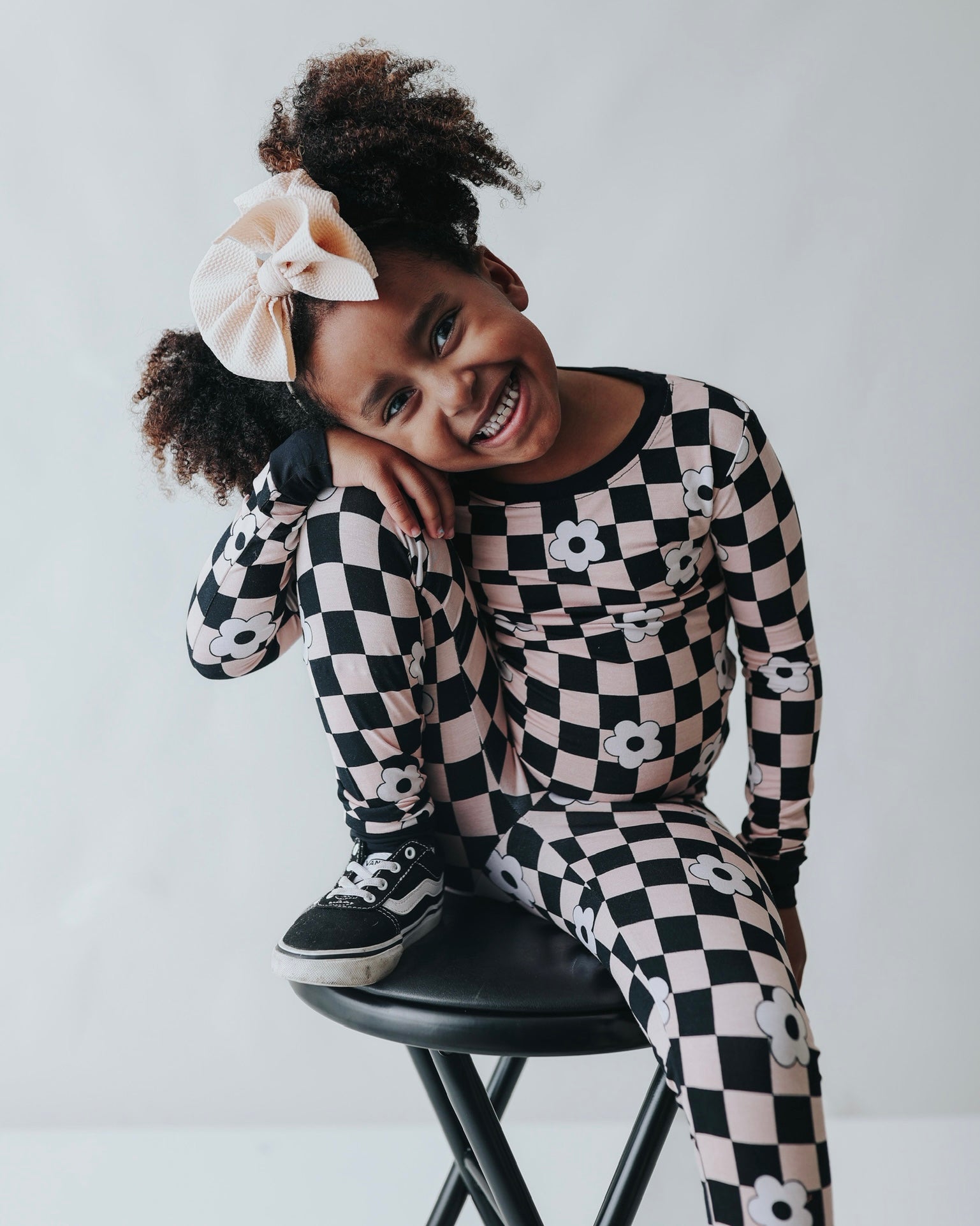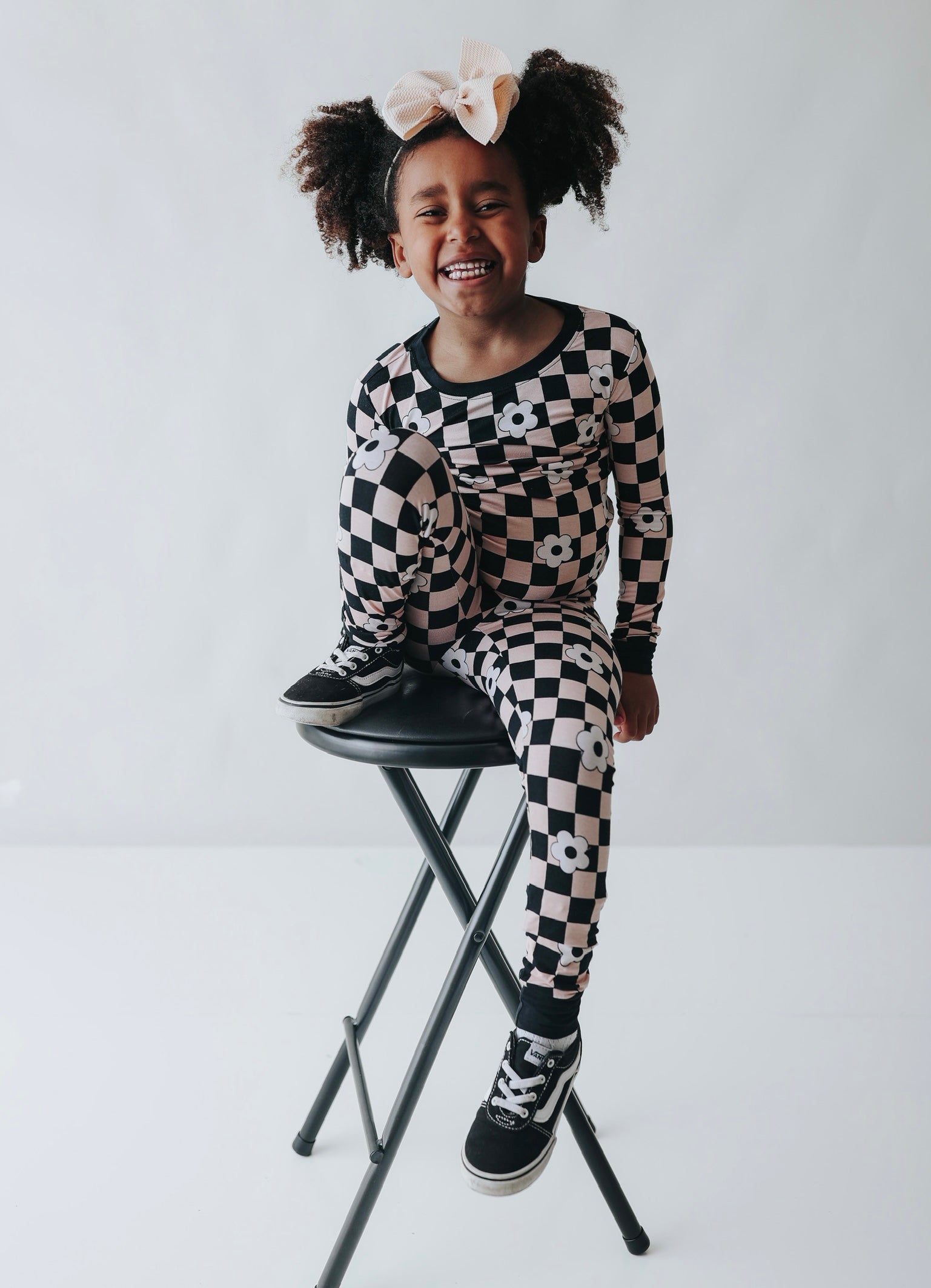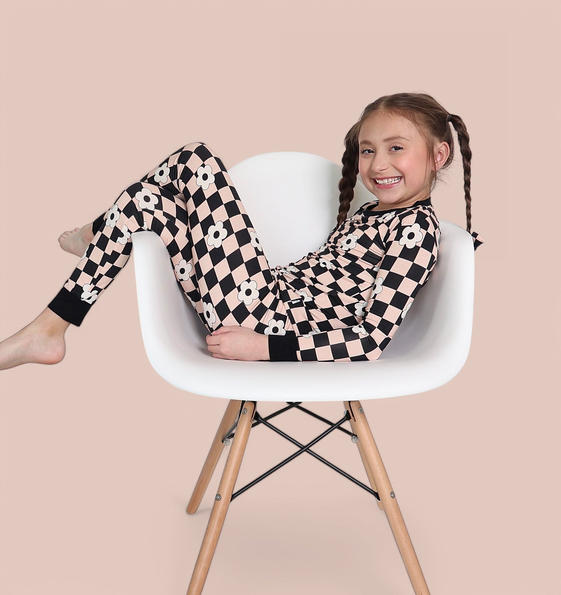Bold, bright, and full of retro charm—our Retro Daisy Checks Dream Set is here to bring style and softness to your little one’s bedtime and beyond! Featuring a playful black-and-pink checkered print adorned with cheerful white daisies, this long-sleeve pajama set is as eye-catching as it is comfy.