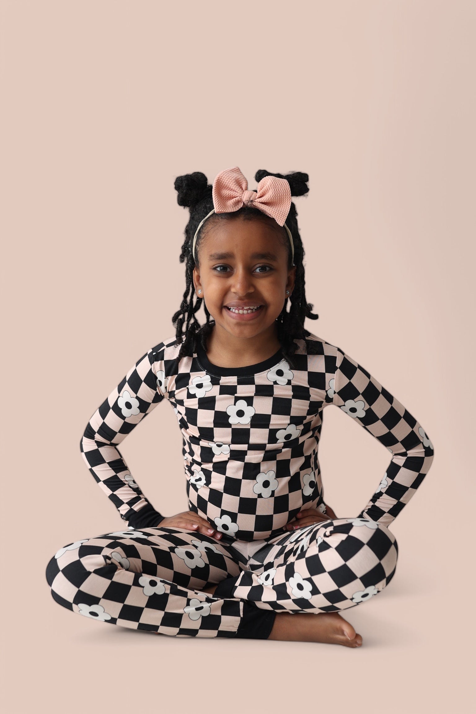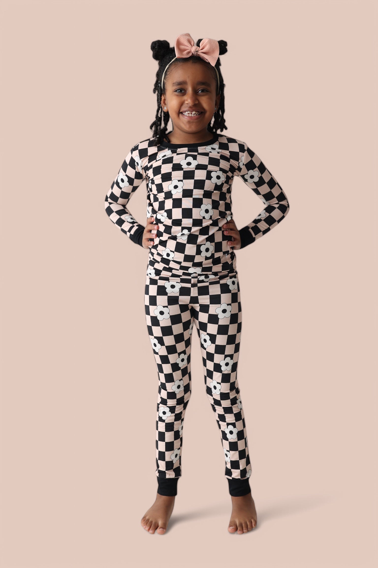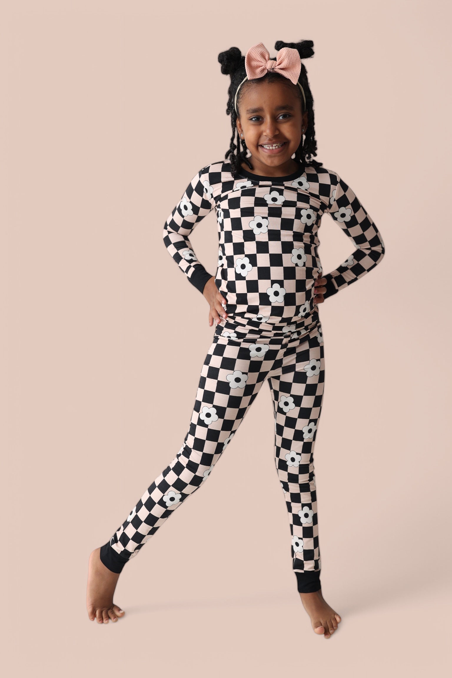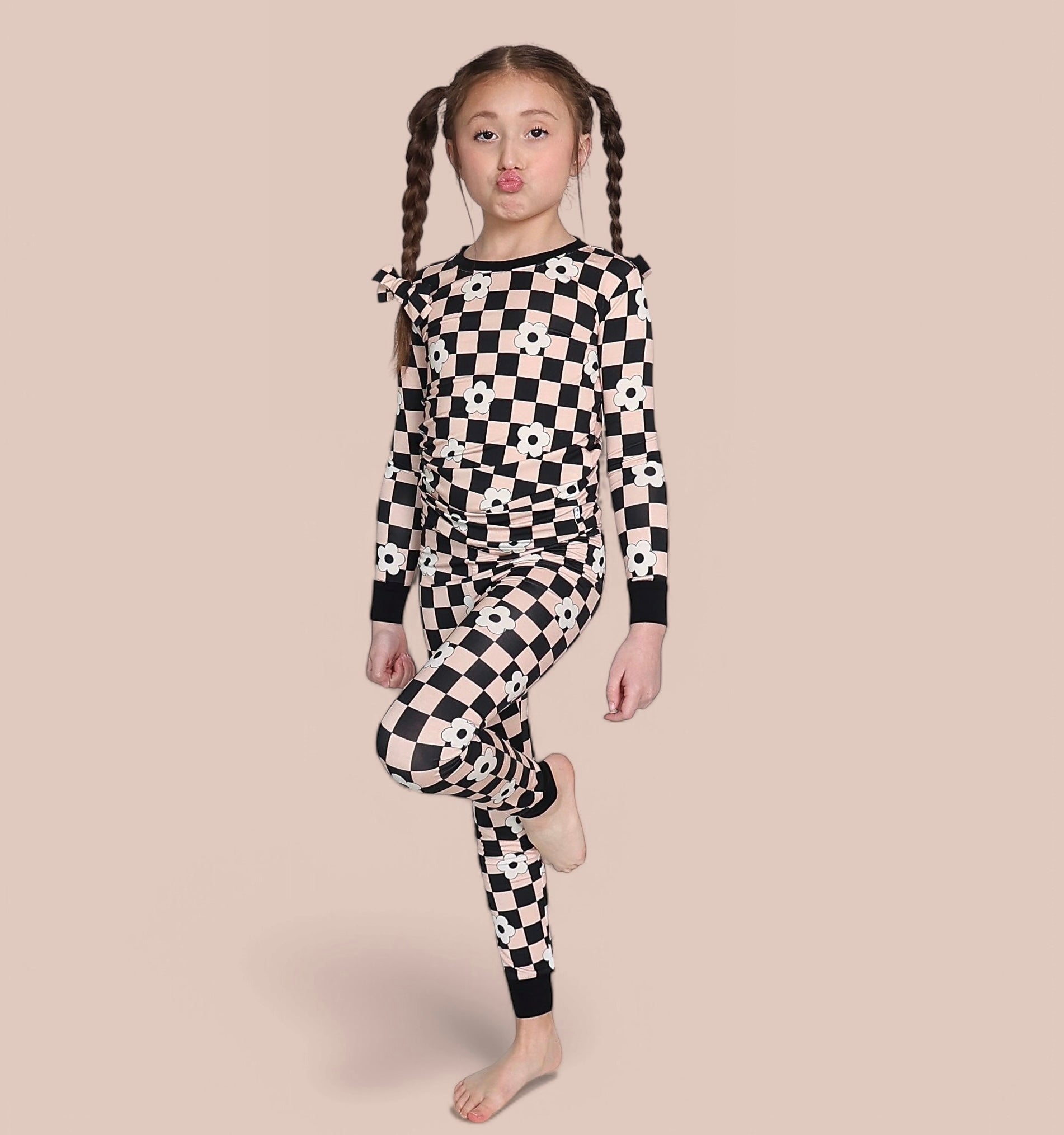 Bold, bright, and full of retro charm—our Retro Daisy Checks Dream Set is here to bring style and softness to your little one’s bedtime and beyond! Featuring a playful black-and-pink checkered print adorned with cheerful white daisies, this long-sleeve pajama set is as eye-catching as it is comfy.