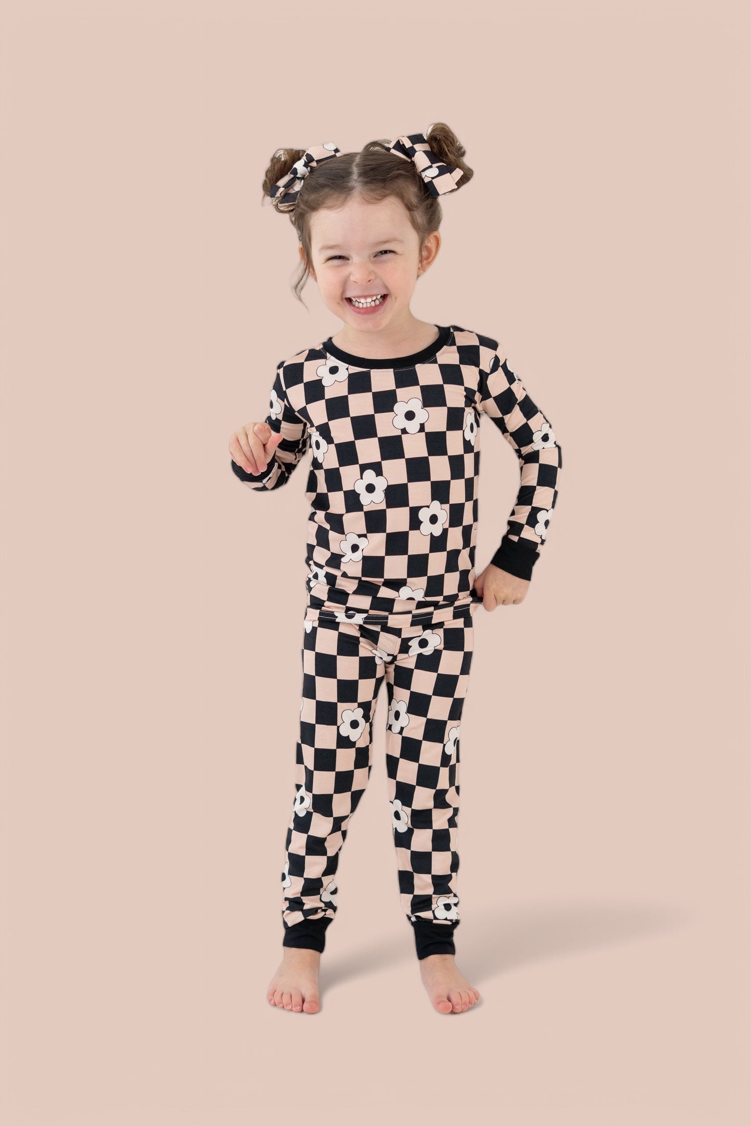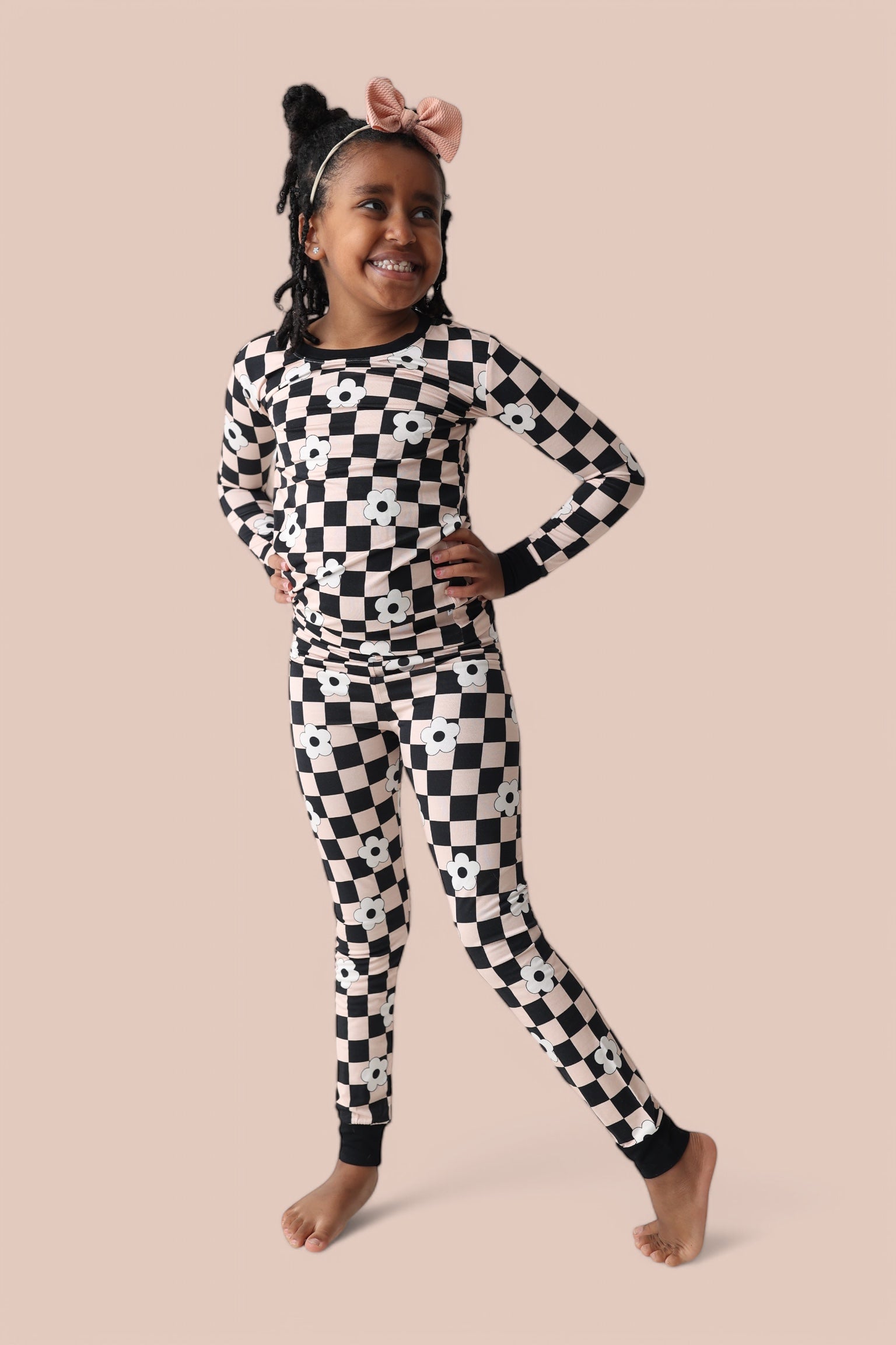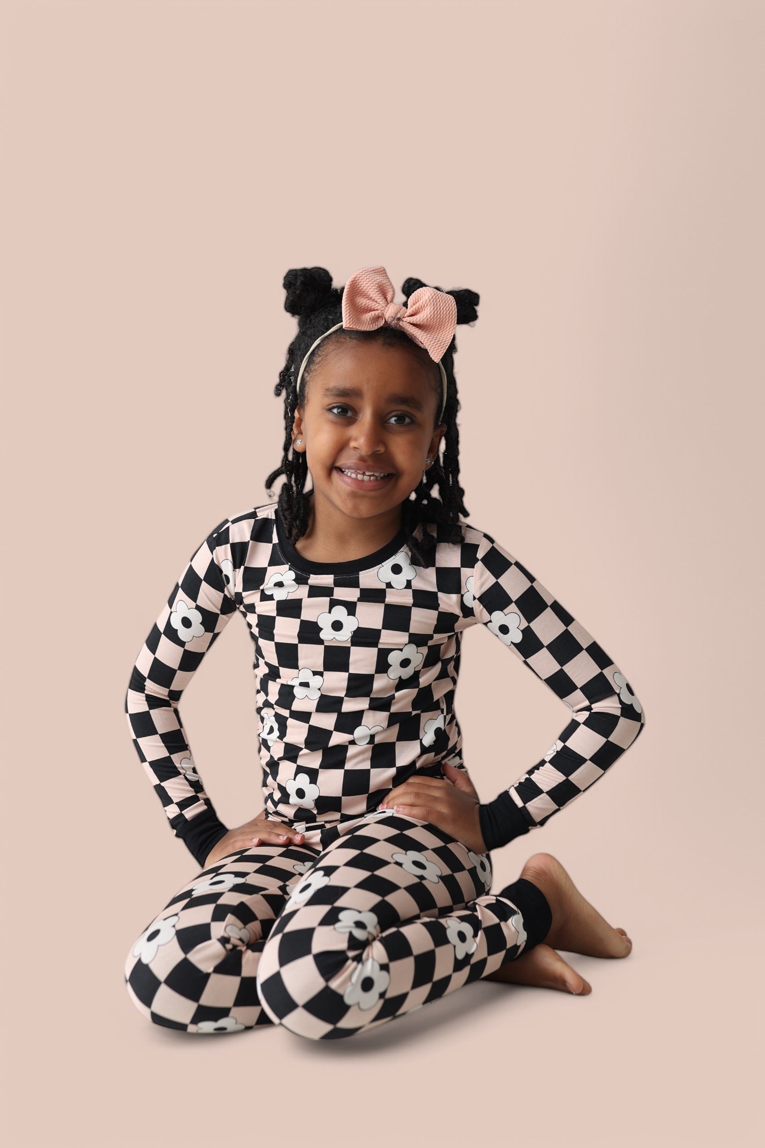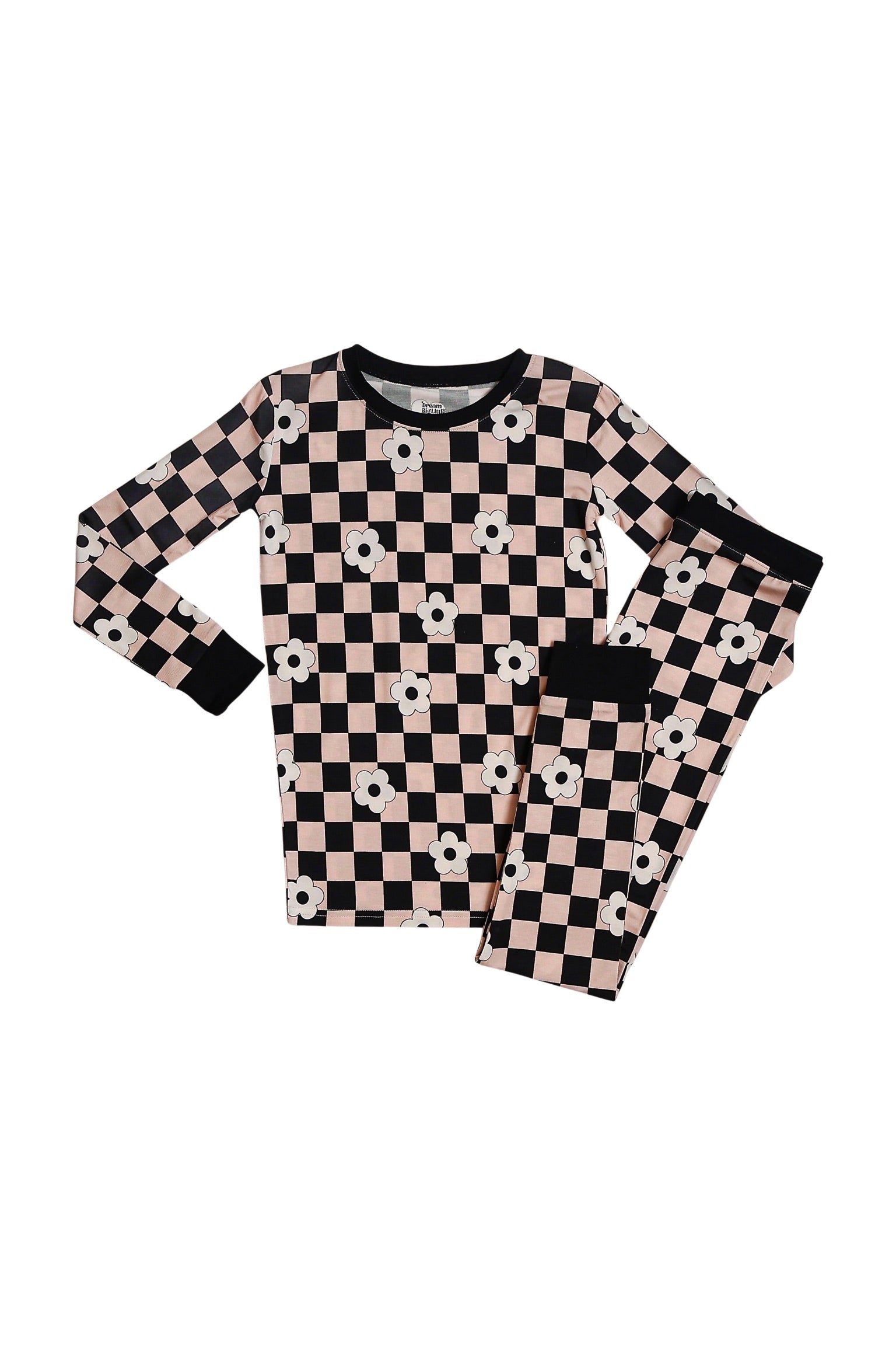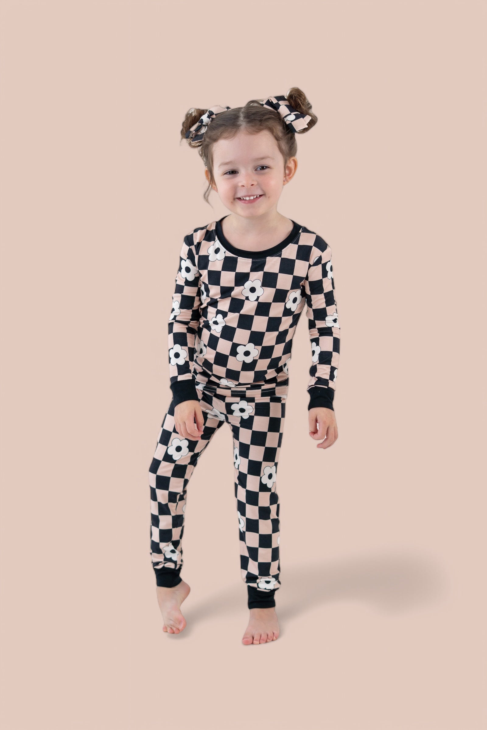 Bold, bright, and full of retro charm—our Retro Daisy Checks Dream Set is here to bring style and softness to your little one’s bedtime and beyond! Featuring a playful black-and-pink checkered print adorned with cheerful white daisies, this long-sleeve pajama set is as eye-catching as it is comfy.