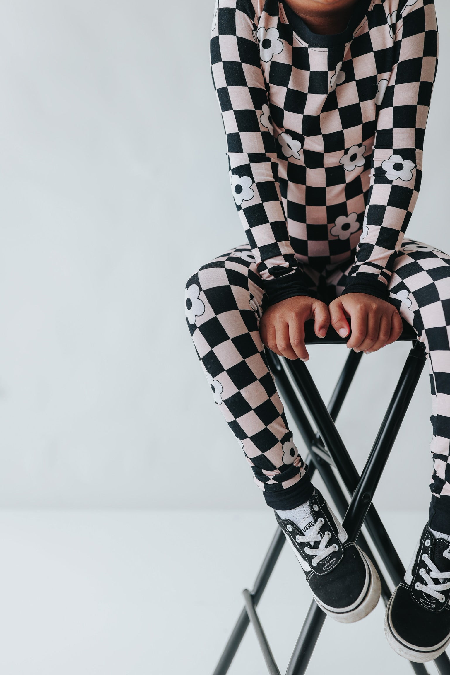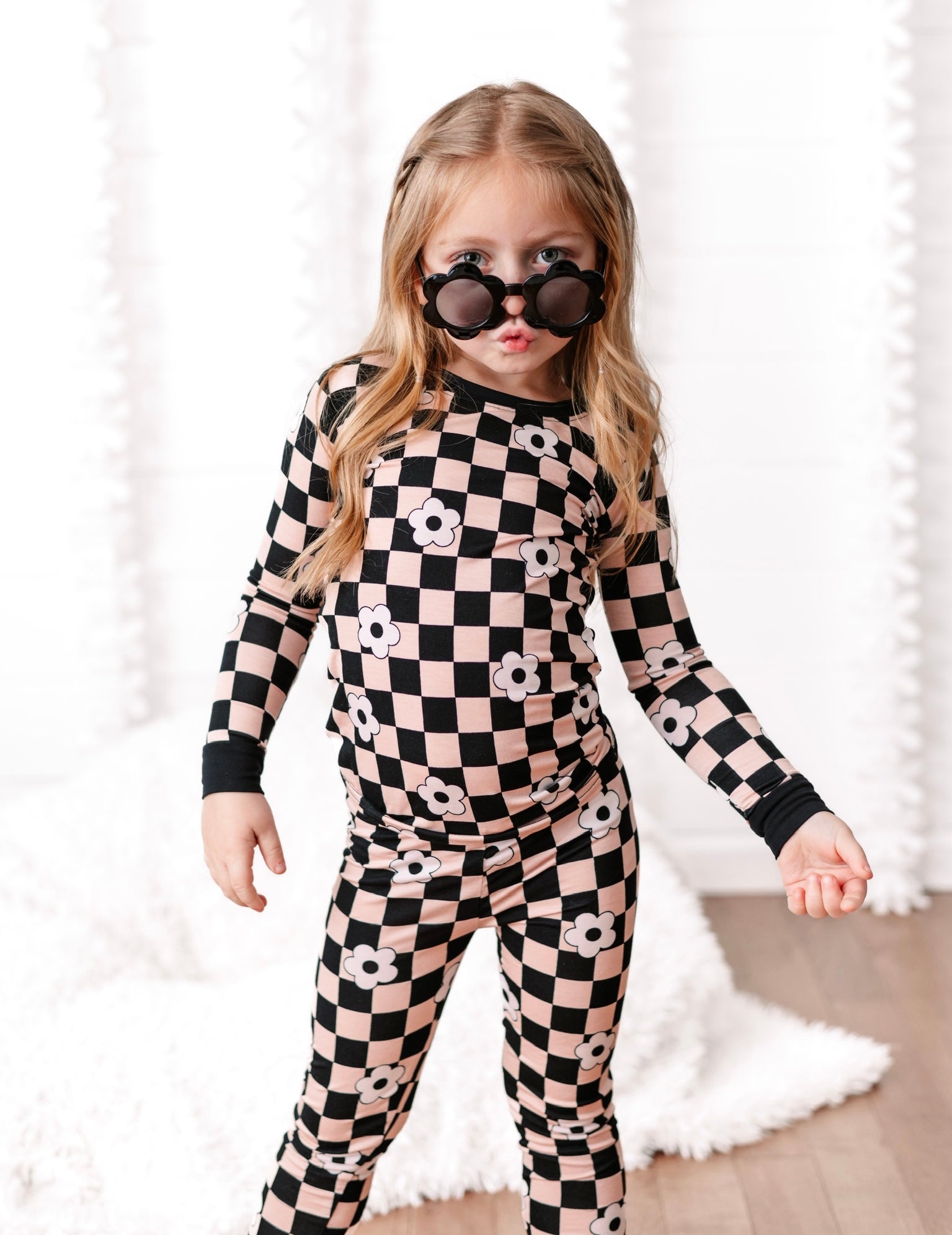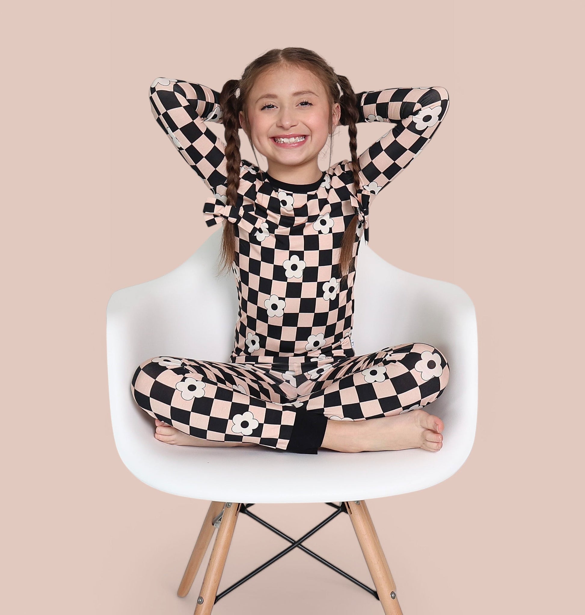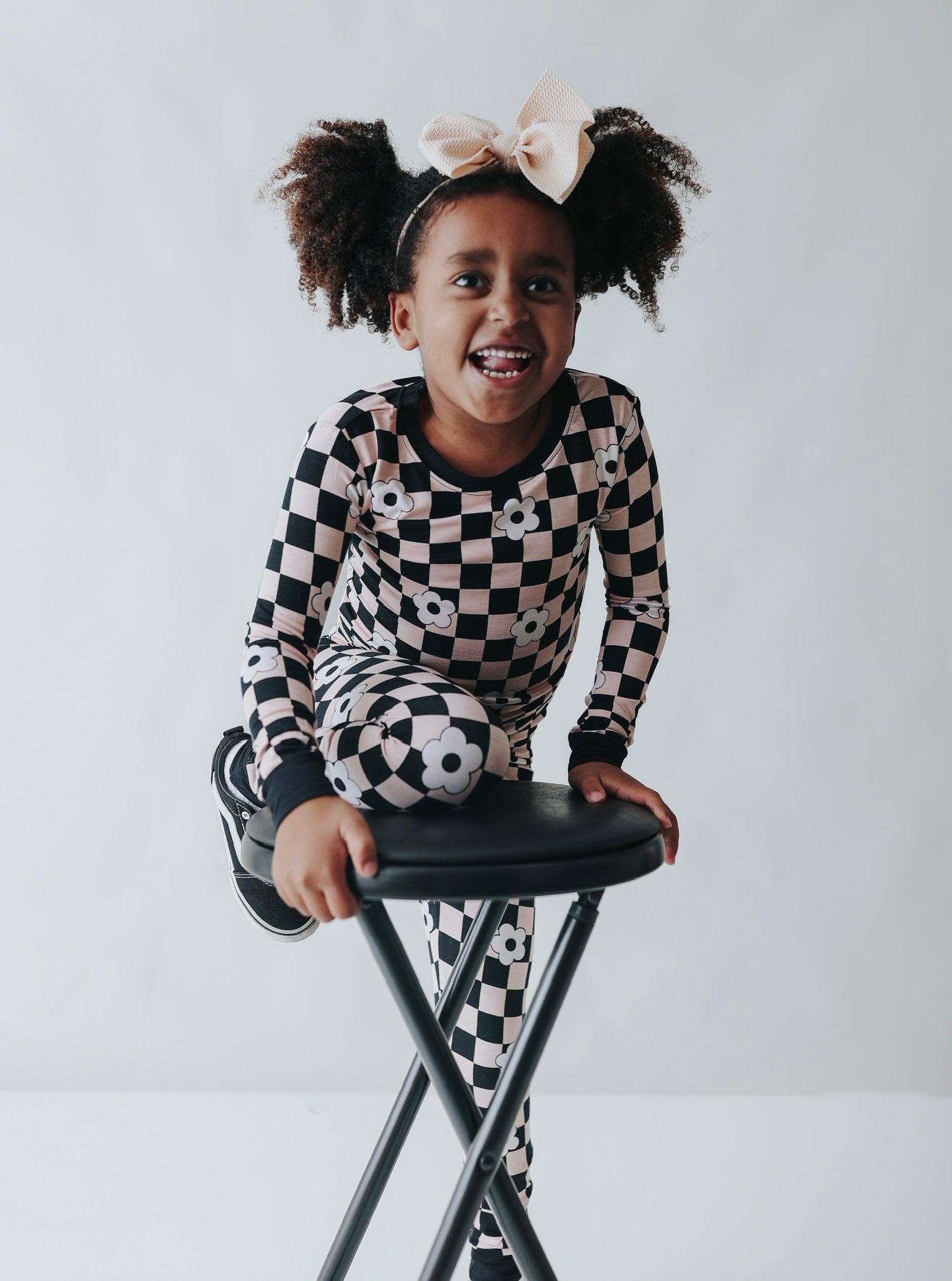 Bold, bright, and full of retro charm—our Retro Daisy Checks Dream Set is here to bring style and softness to your little one’s bedtime and beyond! Featuring a playful black-and-pink checkered print adorned with cheerful white daisies, this long-sleeve pajama set is as eye-catching as it is comfy.