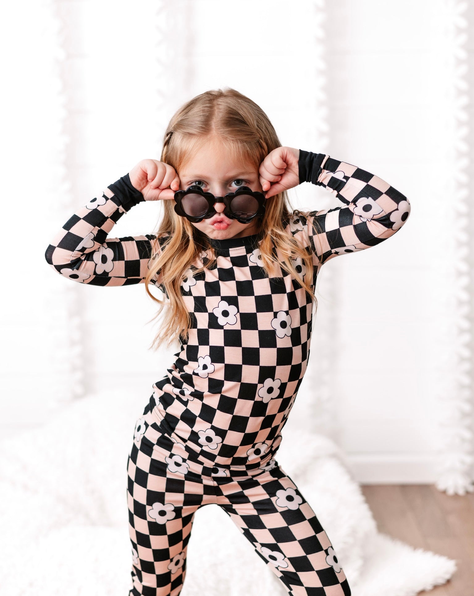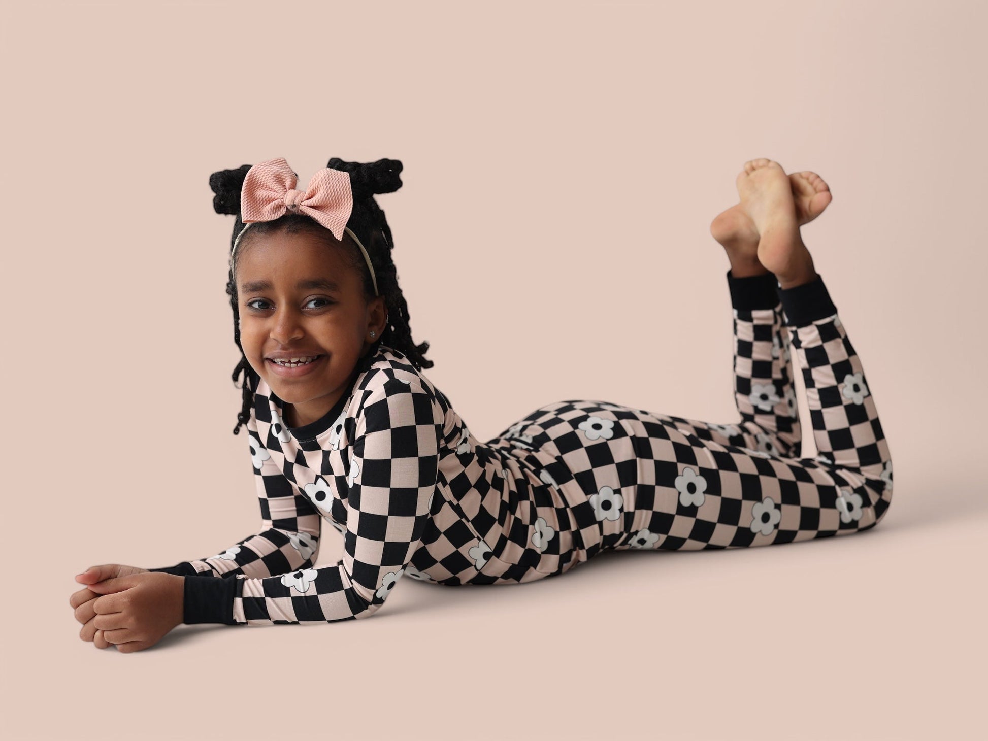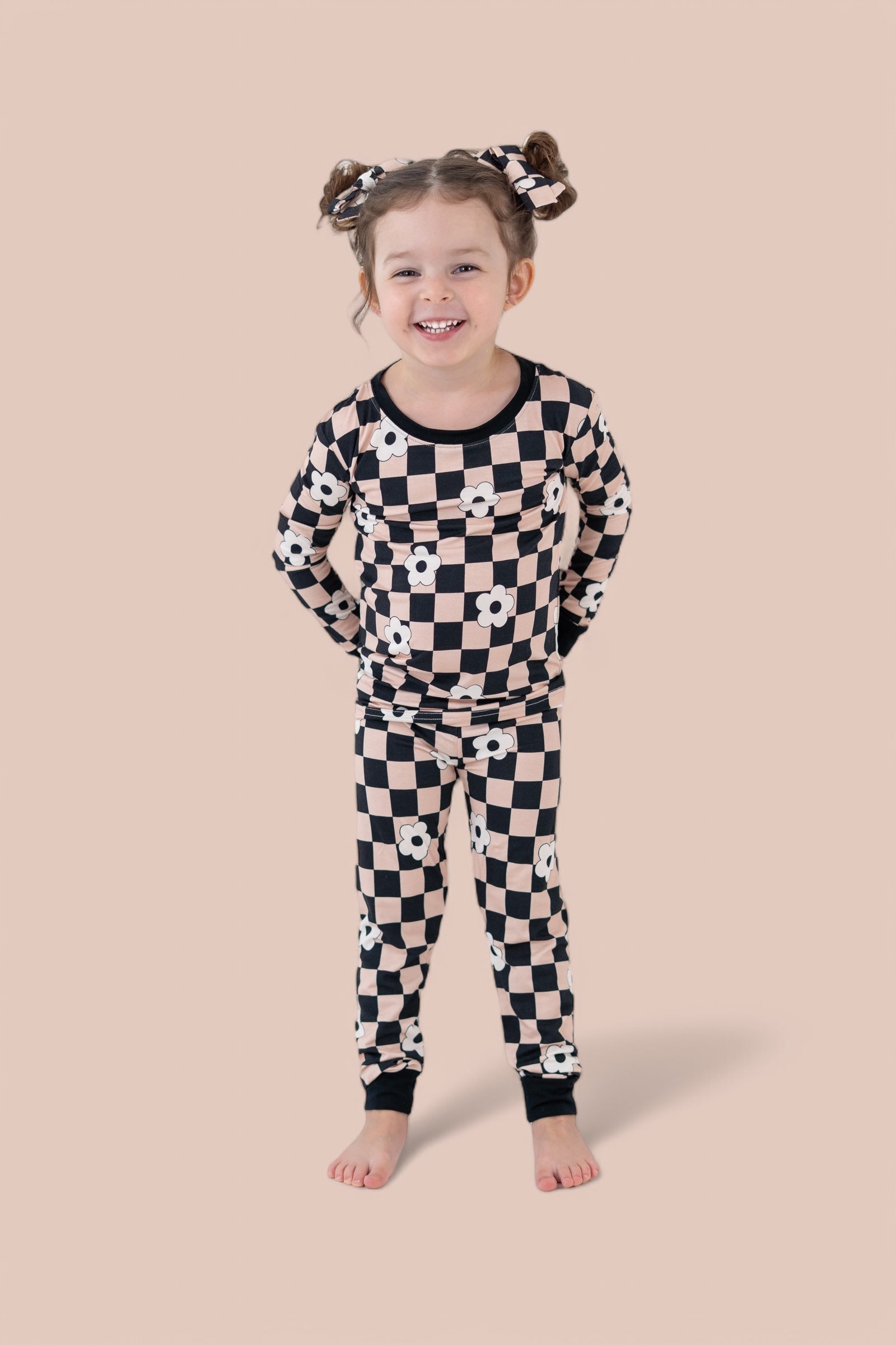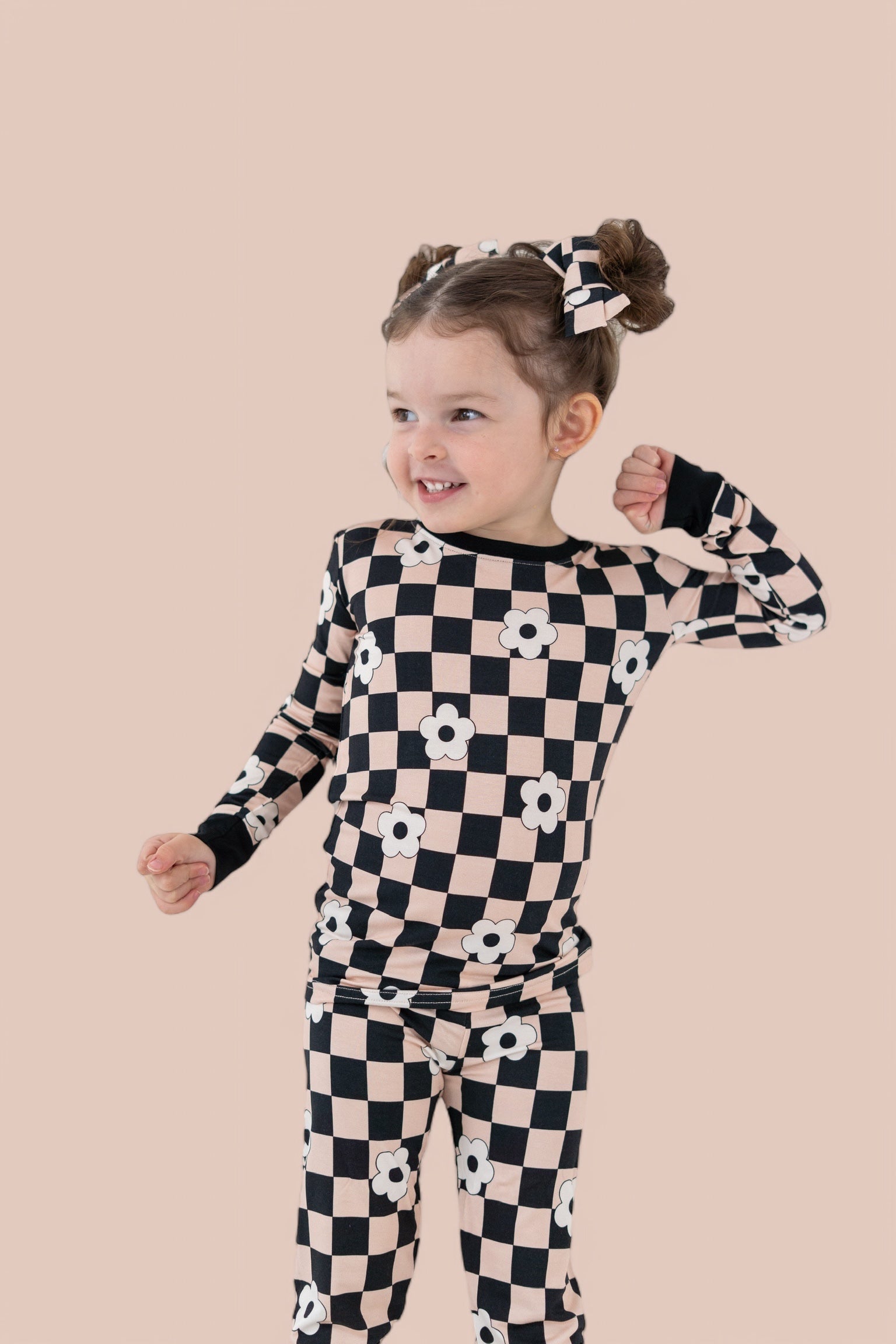 Bold, bright, and full of retro charm—our Retro Daisy Checks Dream Set is here to bring style and softness to your little one’s bedtime and beyond! Featuring a playful black-and-pink checkered print adorned with cheerful white daisies, this long-sleeve pajama set is as eye-catching as it is comfy.