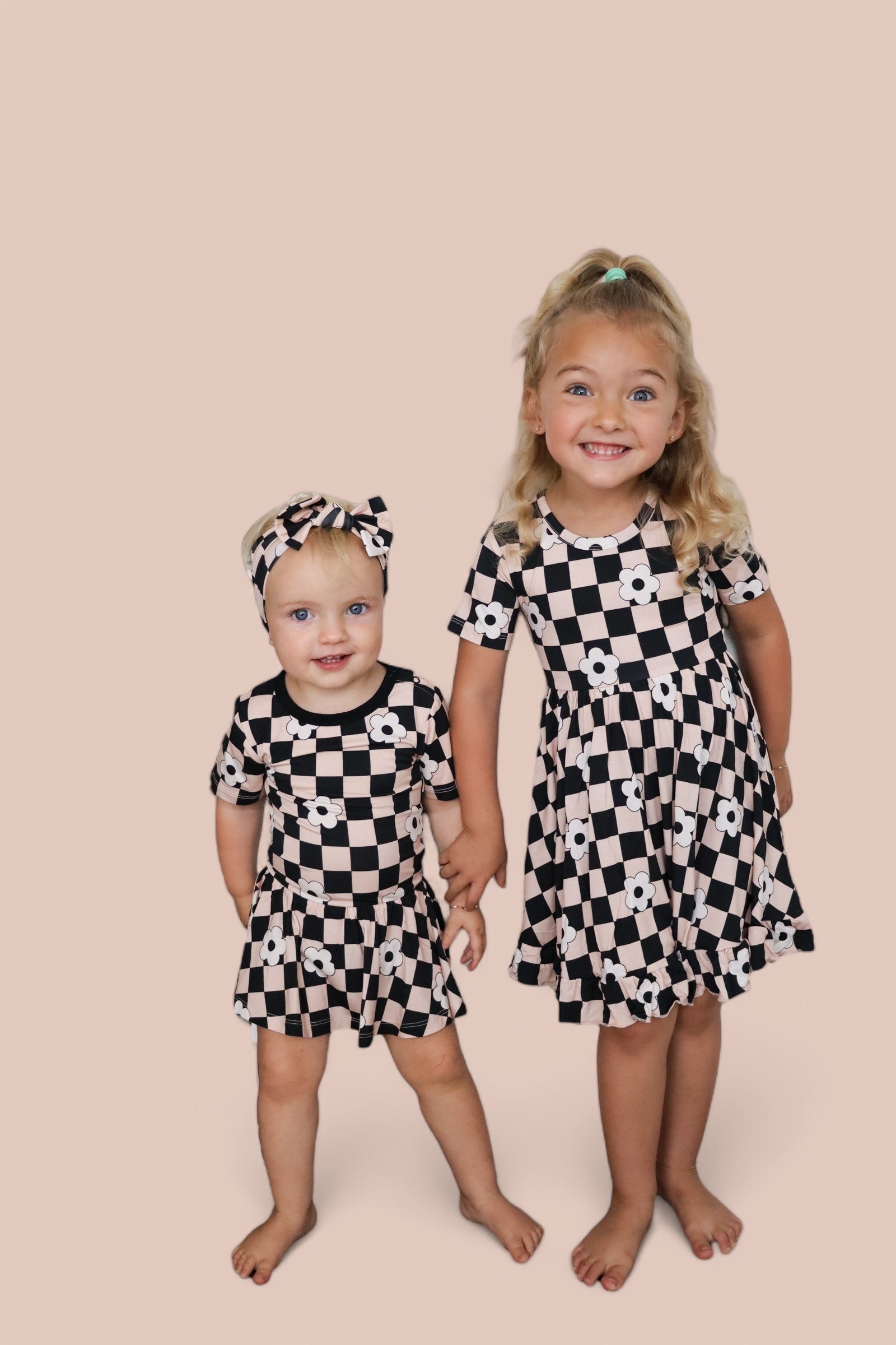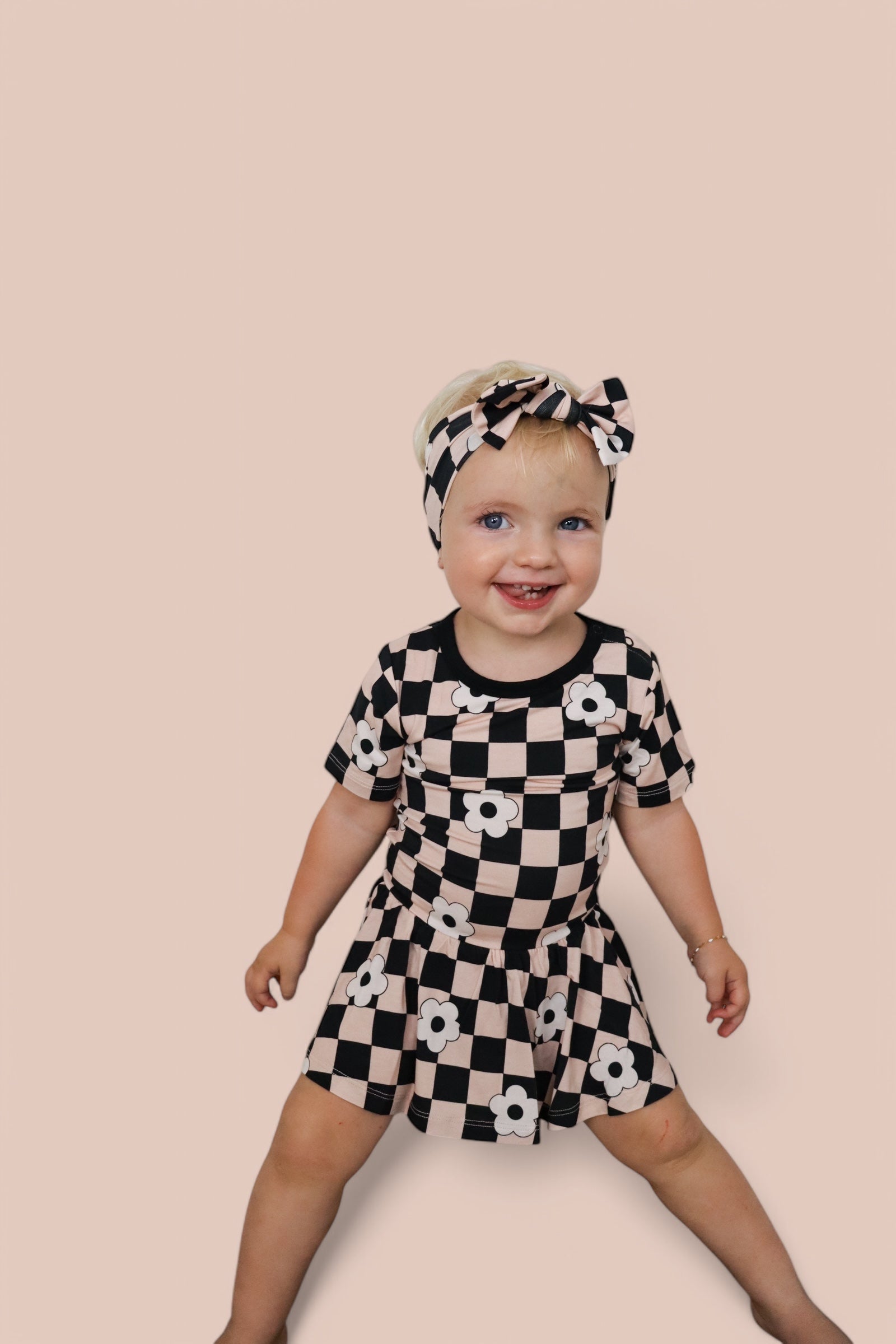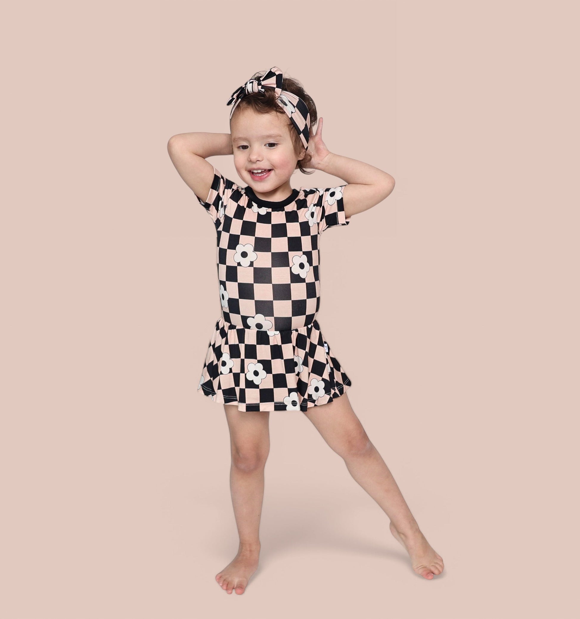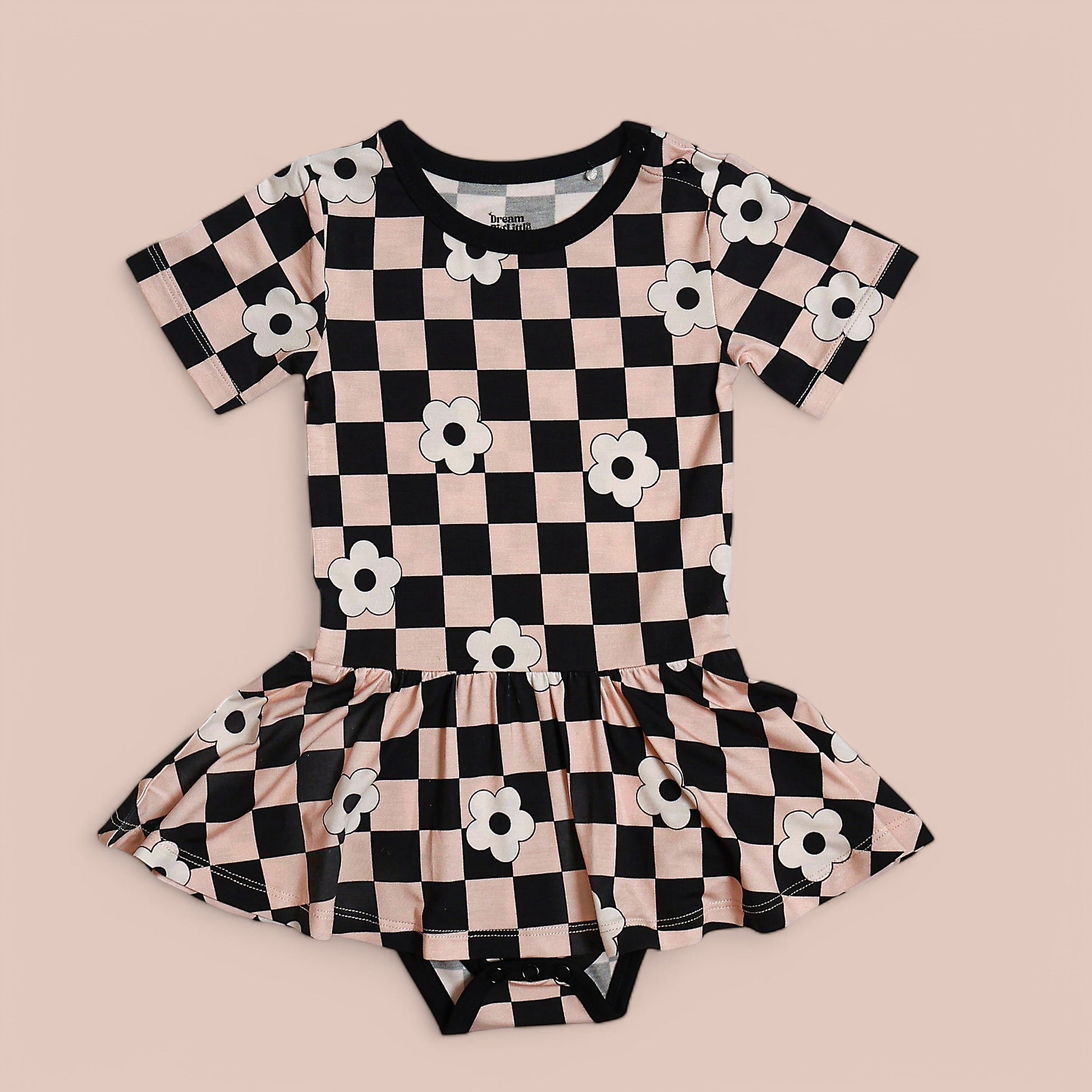 Our Retro Daisy Checks Dream Bodysuit Dress brings a nostalgic twist to everyday style with its bold pink-and-black checkerboard pattern and scattered white daisies. This short sleeve dress is perfect for warm days filled with play, snuggles, and twirls.