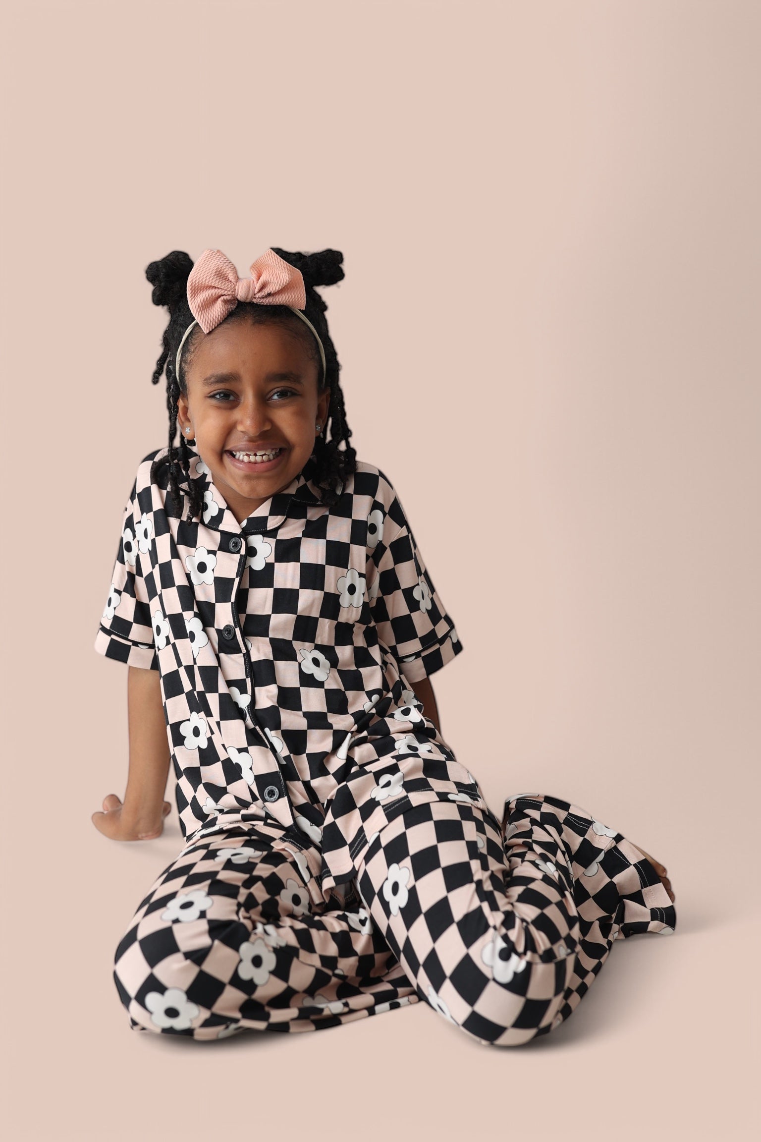 Add a bold twist to your little one’s wardrobe with our Retro Daisy Checks Dream Girl’s Flare Set! Featuring a groovy pink and black diagonal checkerboard print with playful white daisies, this short sleeve top and flare pant set brings retro charm to the modern day.
