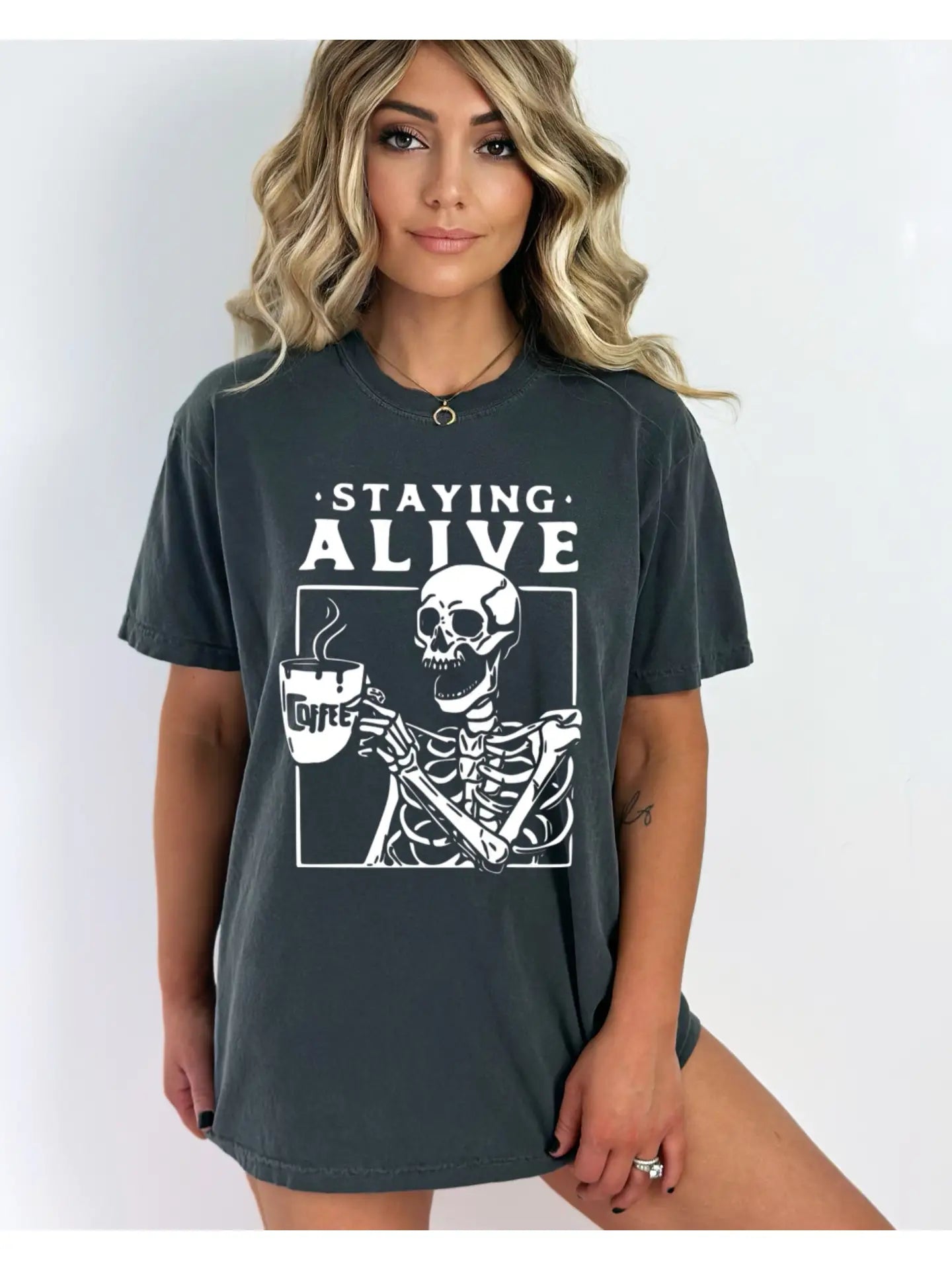 stayin' alive in style with our skeleton tee! This fun shirt is perfect for coffee lovers, featuring a skeleton holding a cup of joe. Stayin' alive never looked so good!